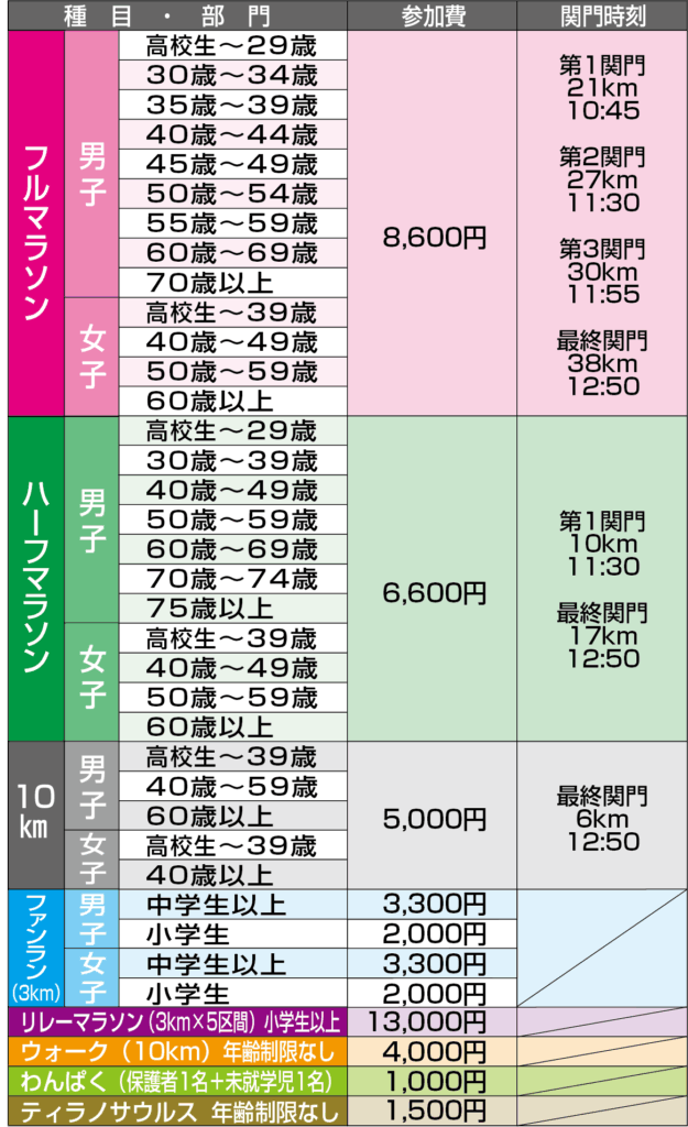 種目・部門・参加費・関門時刻